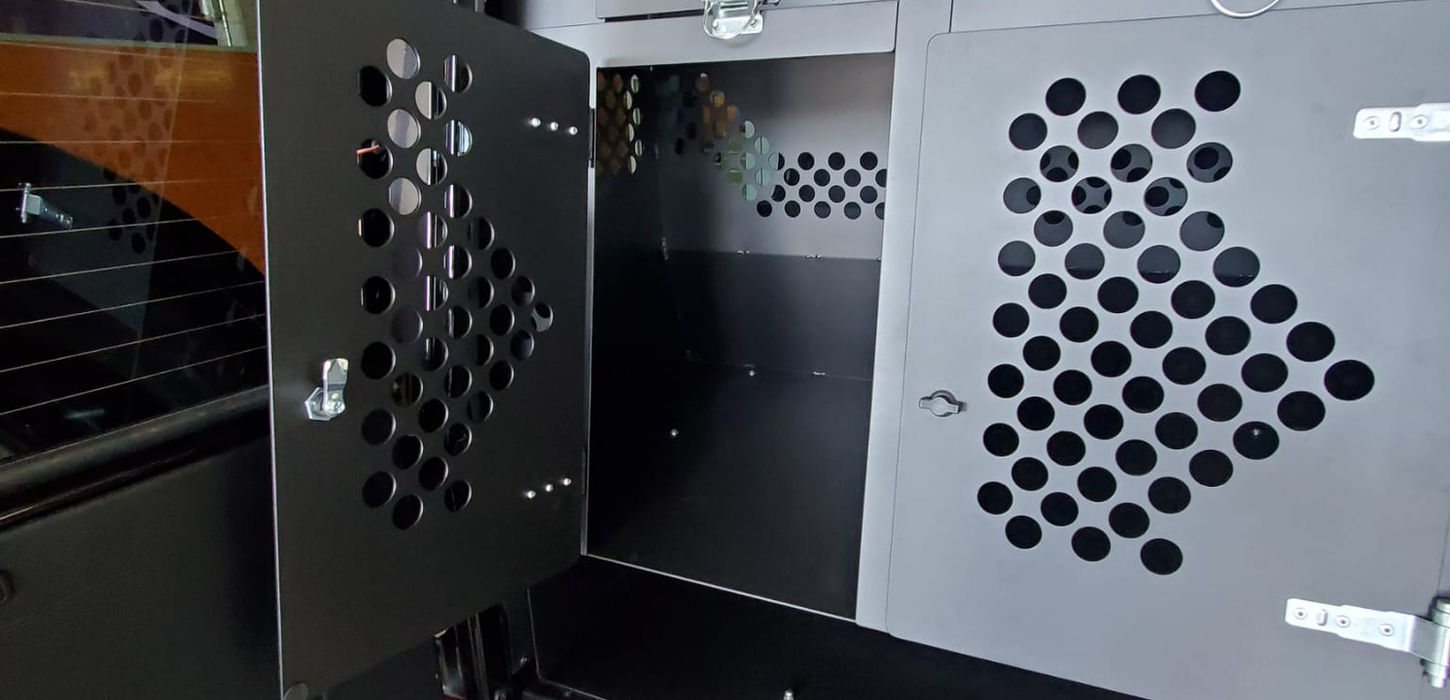Divers rangements et compartiments sur mesure avec portes amovible. Le tout thermolaqué et entièrement démontable facilement.